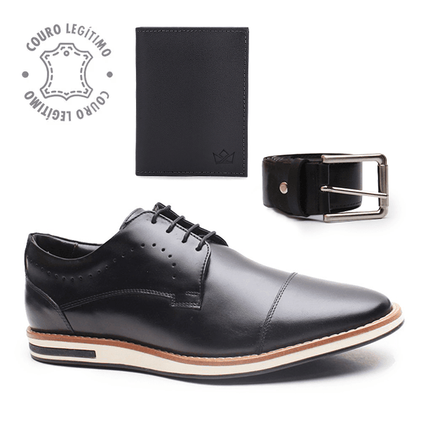 Kit Sapatênis Em Couro Preto + Cinto + Carteira - 31016pt